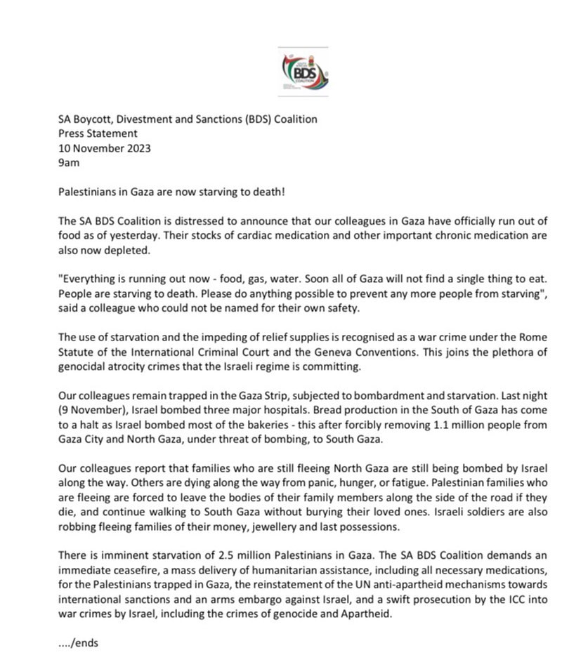 There is imminent starvation of 2.5 million Palestinians in Gaza. The SA BDS Coalition demands an immediate ceasefire, a mass delivery of humanitarian assistance, including all necessary medications, for the Palestinians trapped in Gaza, the reinstatement of the UN anti-apartheid mechanisms towards international sanctions and an arms embargo against Israel, and a swift prosecution by the ICC into war crimes by Israel, including the crimes of genocide and Apartheid.