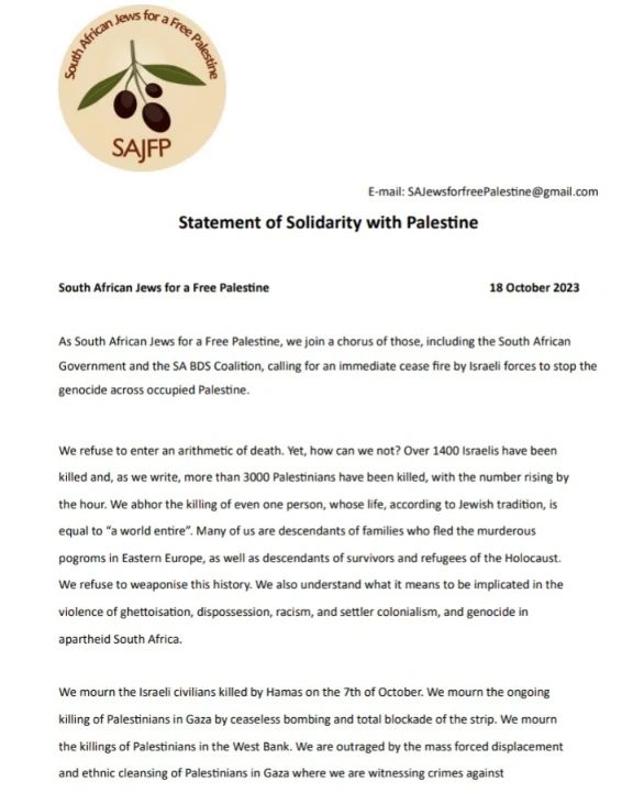 As South African Jews for a Free Palestine, we join a chorus of those, including the South African Government and the SA BDS Coalition, calling for an immediate cease fire by Israeli forces to stop the genocide across occupied Palestine.